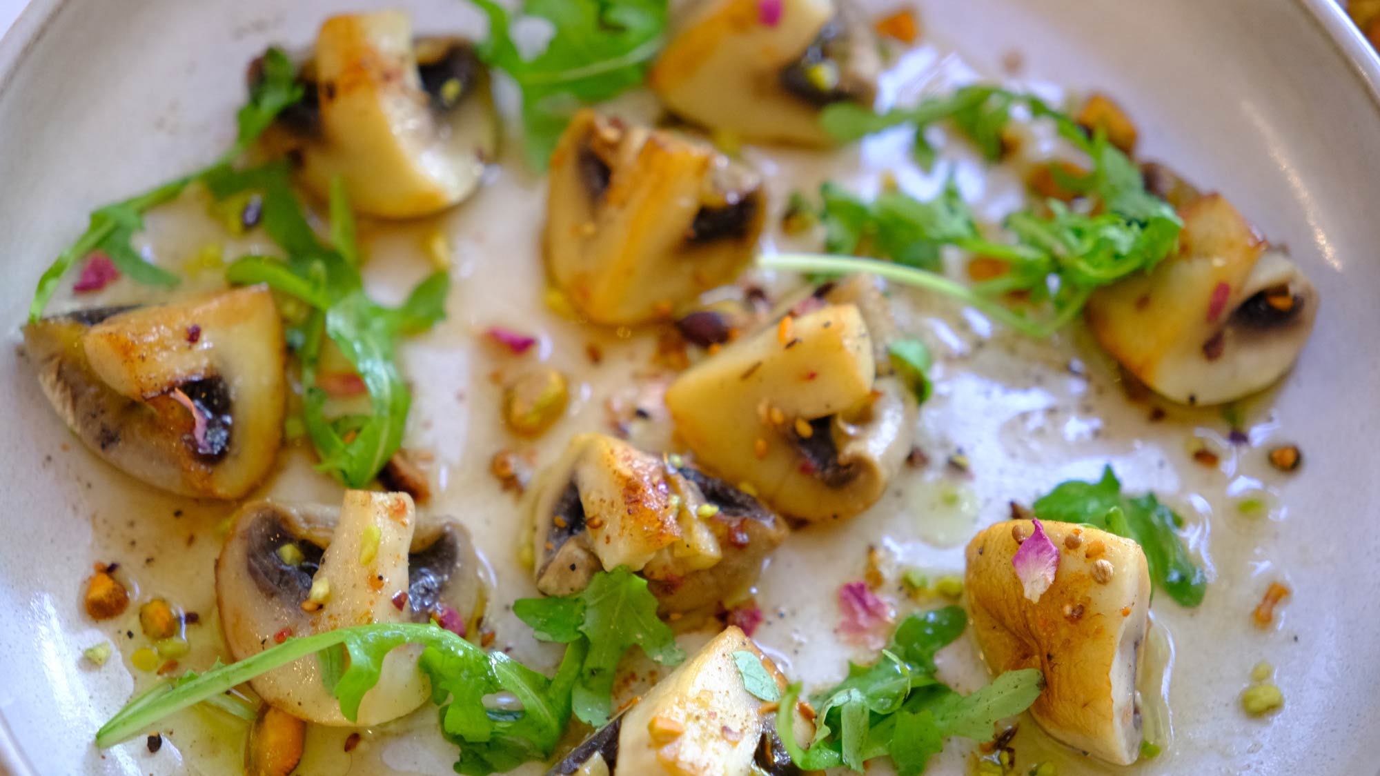 Stekt sopp aromatisert med dukkah og Qazvinpistasjnøtter